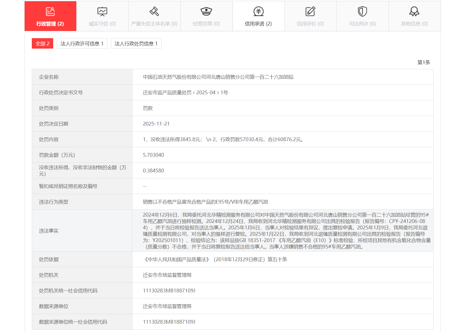 行政处罚决定书显示,当事人违法行为类型:销售以不合格产品冒充合格产品的E95号/VIB车用乙醇汽油。违法事实:2024年12月6日,迁安市市场监督管理局委托河北华精检测服务有限公司对中国天然气股份有限公司河北唐山销售分公司第一百二十六加油站经营的95#车用乙醇汽油进行抽样检测。2024年12月24日,迁安市市场监督管理局收到河北华精检测服务有限公司出具的检验报告(报告编号:CPY-241206-084),并于当日将检验报告送达当事人。