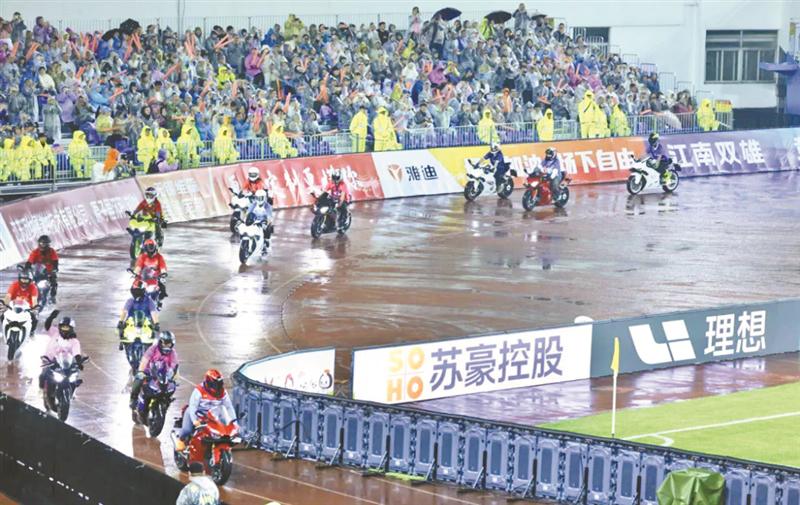 本报讯 4月11日,2026江苏省城市足球联赛常规赛首轮无锡队对阵镇江队开赛前,当主持人播报张雪机车车友队即将上场时,全场爆发出雷鸣般的欢呼。这一晚的宜兴市体育中心,不仅有精彩赛事,还有融合了古今特色的舞蹈表演,更有张雪机车车友队以表演嘉宾身份带来酷炫机车秀,让赛事看点十足。