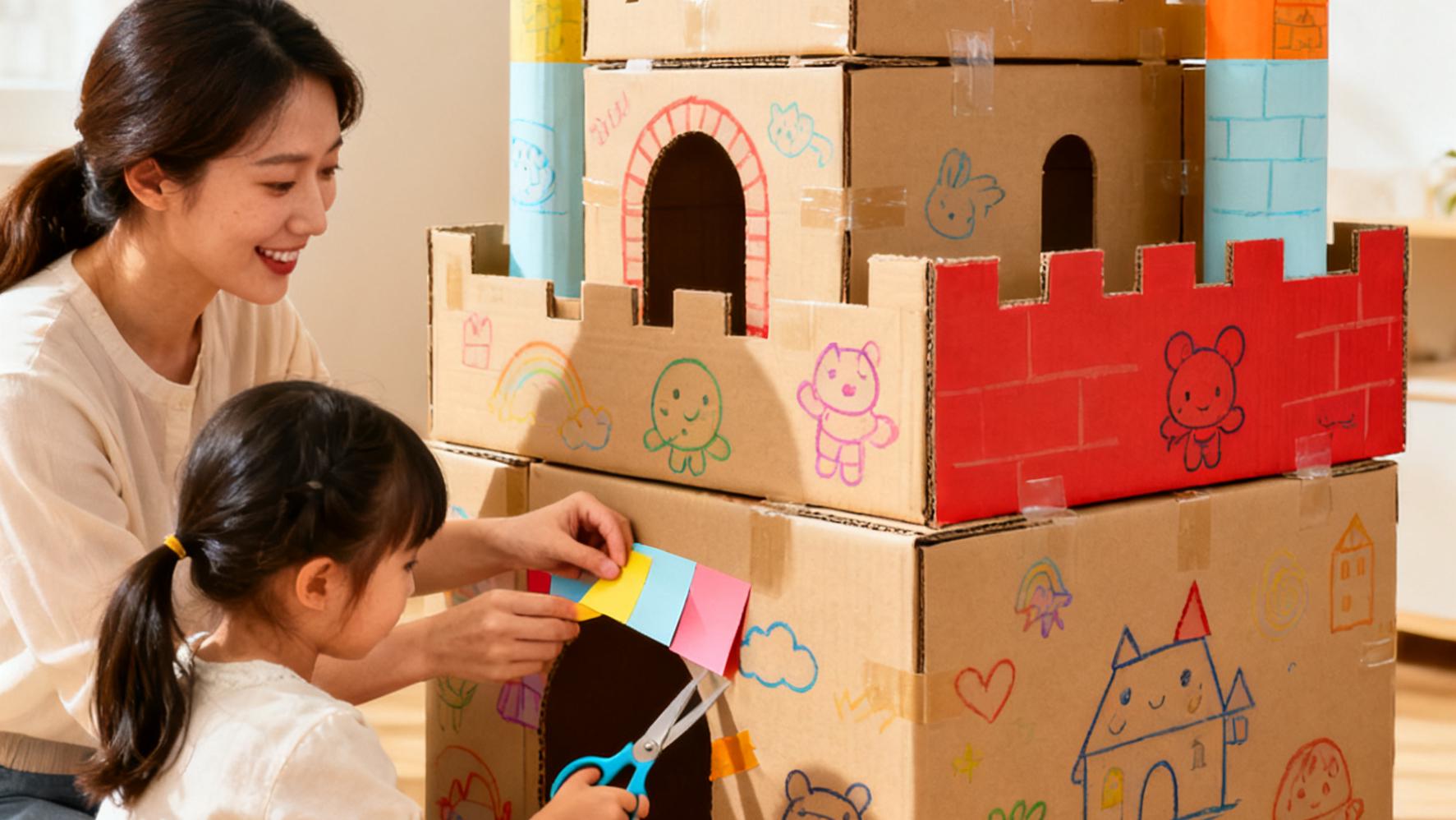 用纸箱制作“城堡”,豆子填充瓶子做成摇铃,激发孩子想象力。