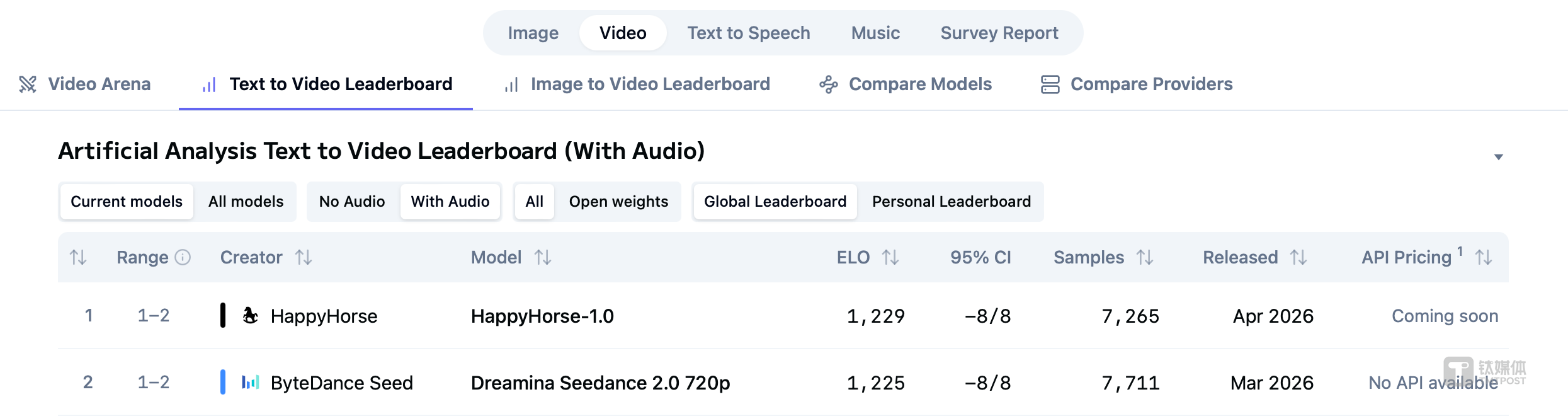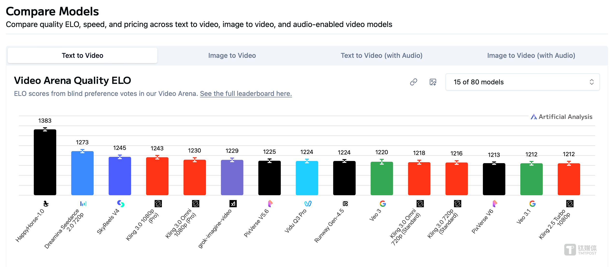 第二件:不到两周后的4月7日,一匹代号为“欢乐马”(HappyHorse-1.0)的匿名模型,毫无征兆地空降全网最权威的 AI 视频盲测榜单 Artificial Analysis,以压倒性的分数直接登顶。